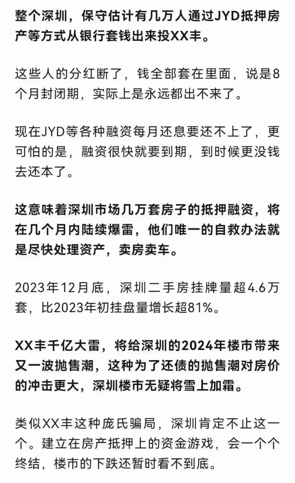 流传的“小作文”这样分析:现在鼎益丰分红断了,至少也要被套八个月,投资者可能还不上银行的利息,更没钱还本金,投资人唯一的自救办法是低价卖房,因此,深圳楼市将迎来一轮抛售潮。